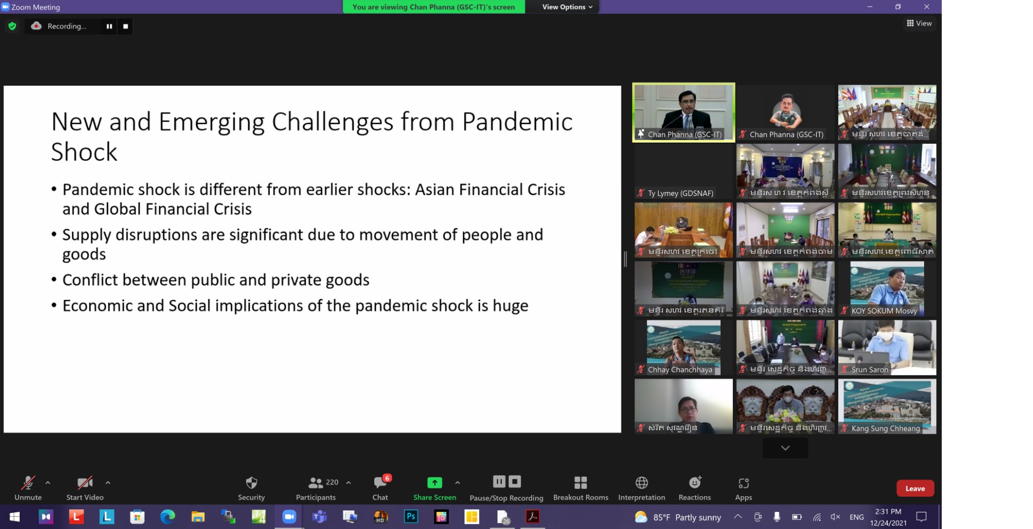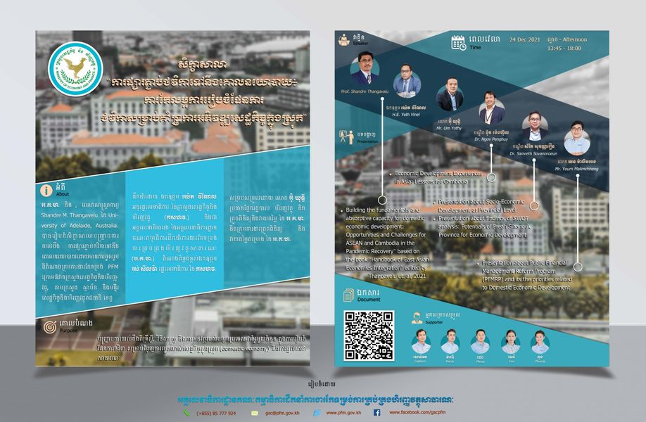 On Friday, 24th December 2021, at 2:00 pm, H.E. Yeth Vinel, Under-Secretary of State of the Ministry of Economy and Finance (MEF) and the Deputy Secretary-General of General Secretariat of PFM Reform Steering Committee (GSC), representative of H.E. Ros Seilava, Secretary of State of the MEF and the Secretary-General of GSC, accompanied by Mr. Um Youthy, Head of Admin, Finance and M&E Division, senior specialists and specialists of GSC, led a virtual workshop on “Budget-Policy Linkage: Improve Budget Planning to Support Domestic Economic Development” with the participations as the speakers from Professor Shandre M. Thangavelu from University of Adelaide, Australia, GSC advisors, GSC senior specialists and specialists, and representatives of Preah Sihanouk Provincial Department of Economy and Finance. This workshop is intended to raise awareness of theory, methodology, and good practice of some countries in budget formulation to support domestic economic development and to promote public service delivery and with the participation of entities under MEF, capital/provincial departments of economy and finance and line ministries.